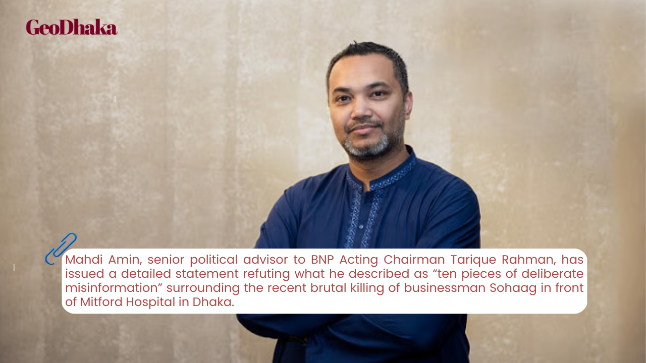 Mahdi Amin, senior political advisor to BNP Acting Chairman Tarique Rahman, has issued a detailed statement refuting what he described as “ten pieces of deliberate misinformation” surrounding the recent brutal killing of businessman Sohaag in front of Mitford Hospital in Dhaka. The statement aims to separate facts from rumors and demand accountability through a fair investigation, while exposing what he claims are politically motivated efforts to malign the BNP.